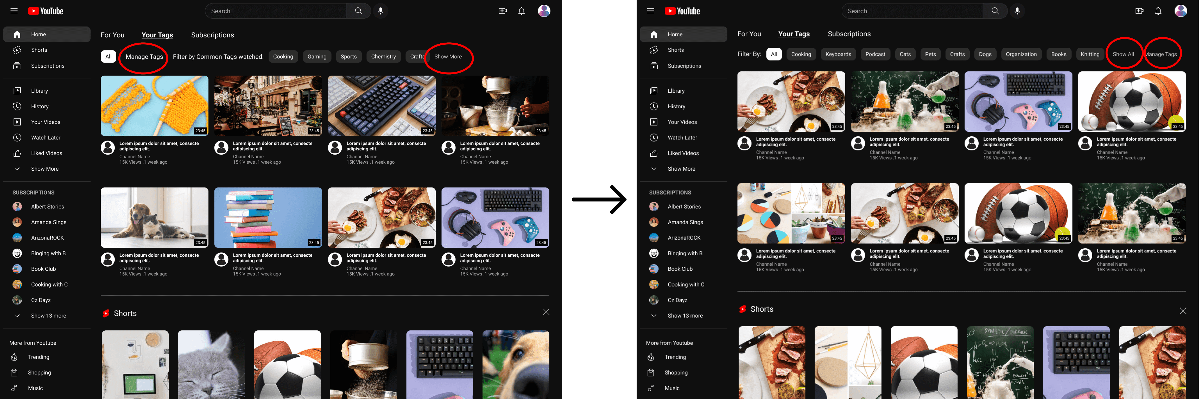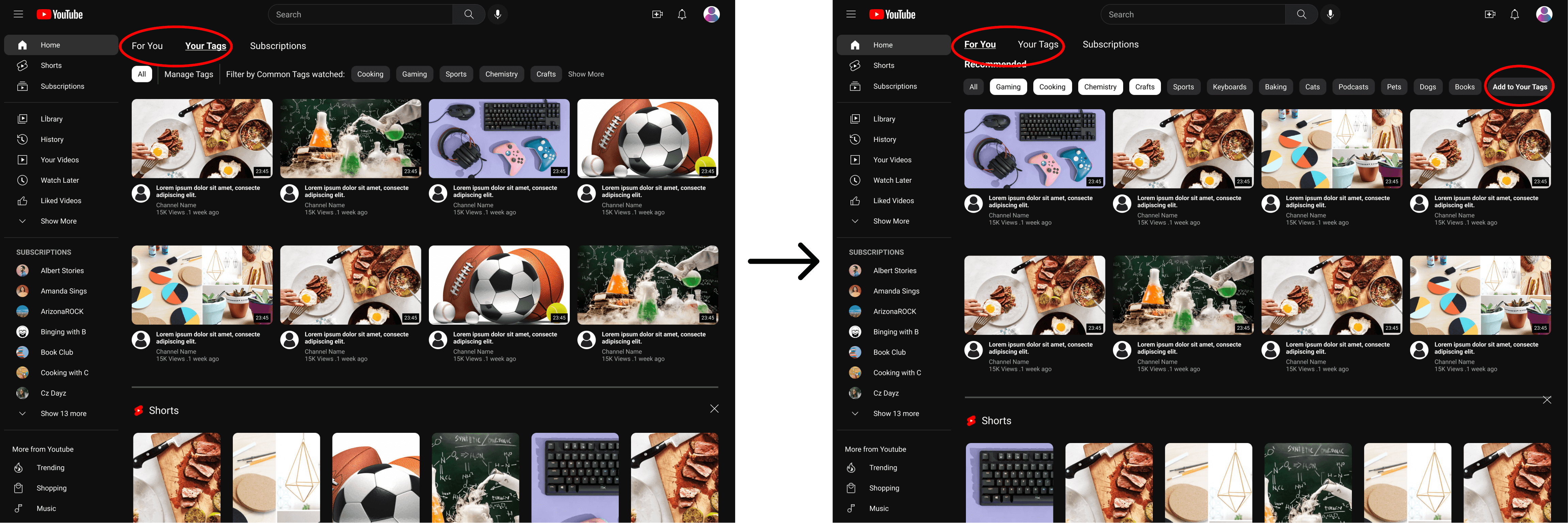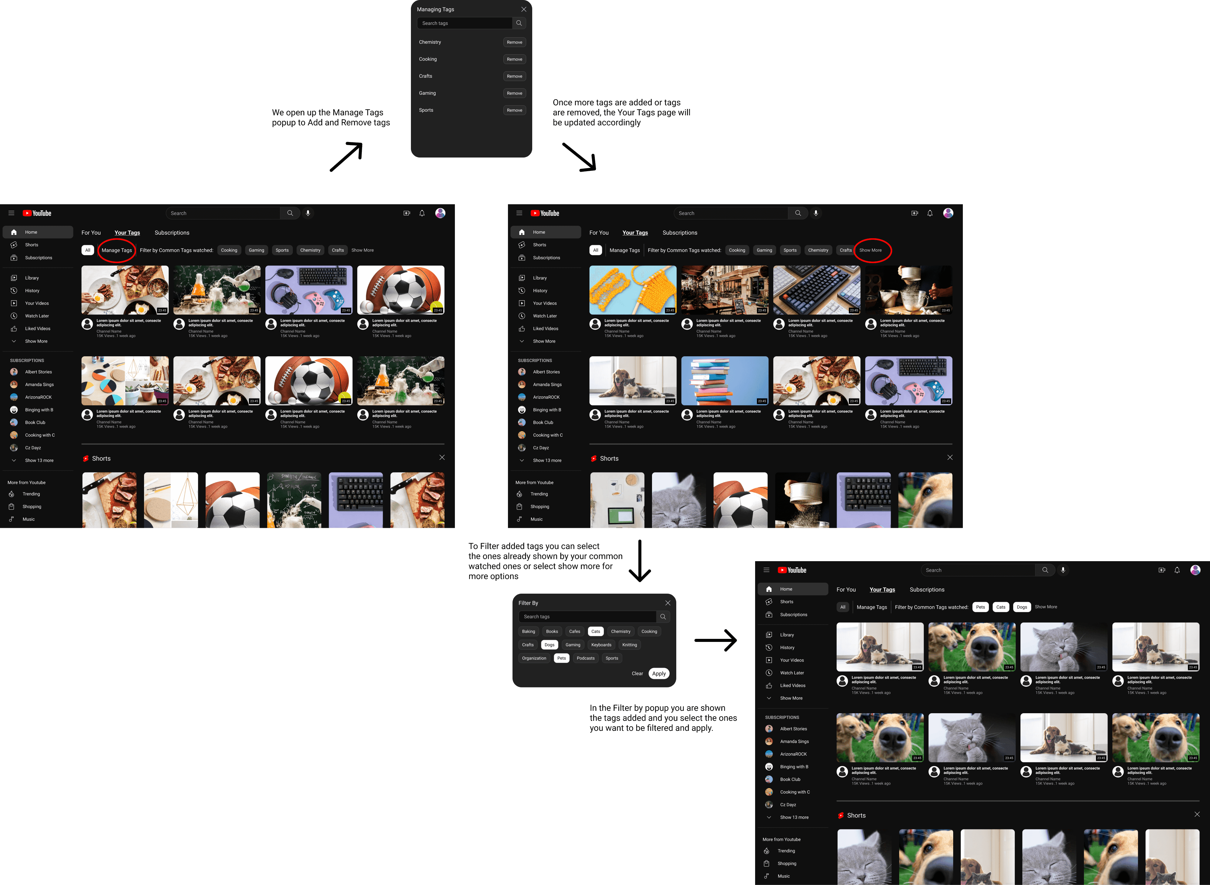 The tags feature is added to the current look of the YouTube homepage. Instead of a separate section for the added tags, it would be a segment of the page when you scroll, much like the shorts segment. The page would then have more labels/ titles to let the user know what section they are in. The tags segment would be the topmost one where the tags currently on YouTube are displayed. You’ll able to search, add, remove, and filter tags at their current spot.
