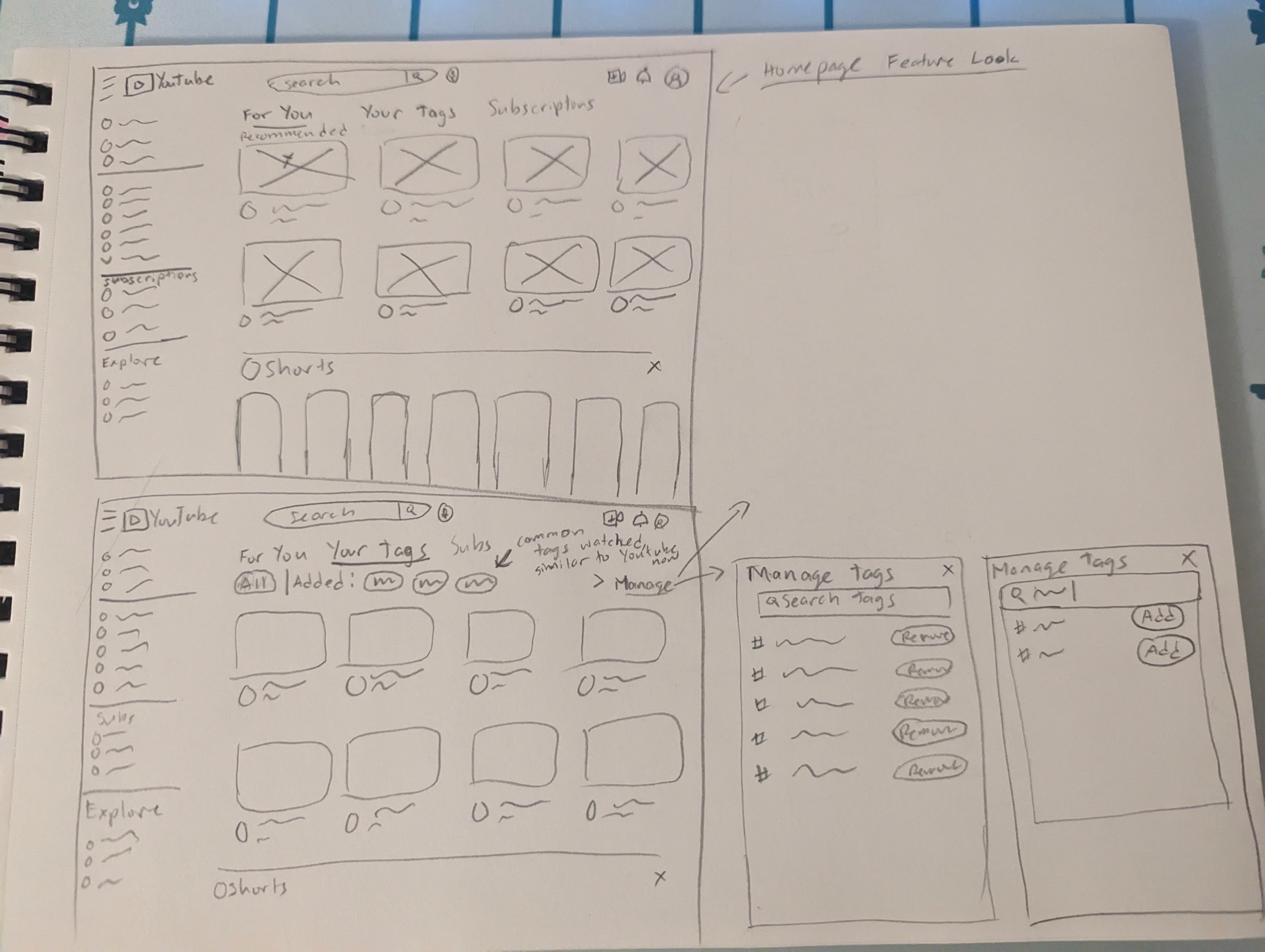 Idea 1 was sketched out showing where the Tags feature would be located. It incorporates YouTube's current design where the tags for filtering would be located and a Manage tags popup for adding and removing tags.