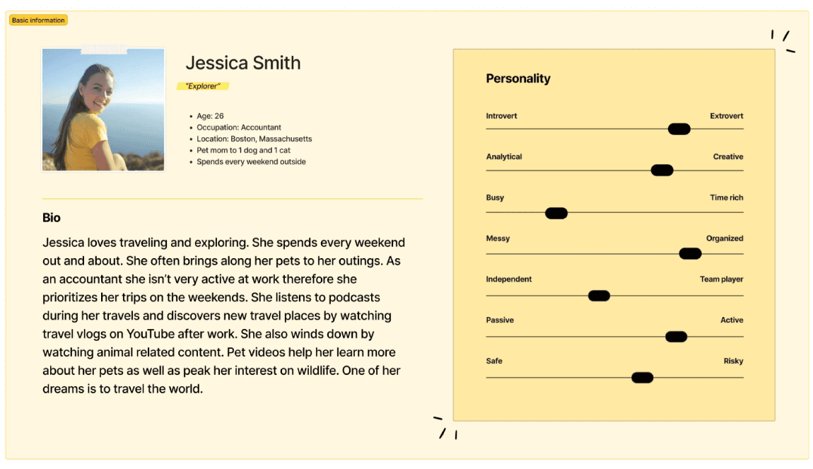 Our persona, Jessica Smith was created to visualize the average demographic of YouTube users. She represents a typical YouTube user who is an avid content consumer that values personalized and relevant video recommendations. Jessica is a working professional in her late 20s, with limited free time and a diverse range of interests. She relies on YouTube to entertain, educate, and inspire her, but often feels overwhelmed by the vast amount of content available. She desires a filtering feature that allows her to efficiently discover videos aligned with her preferences, saving her time and effort in finding relevant content.