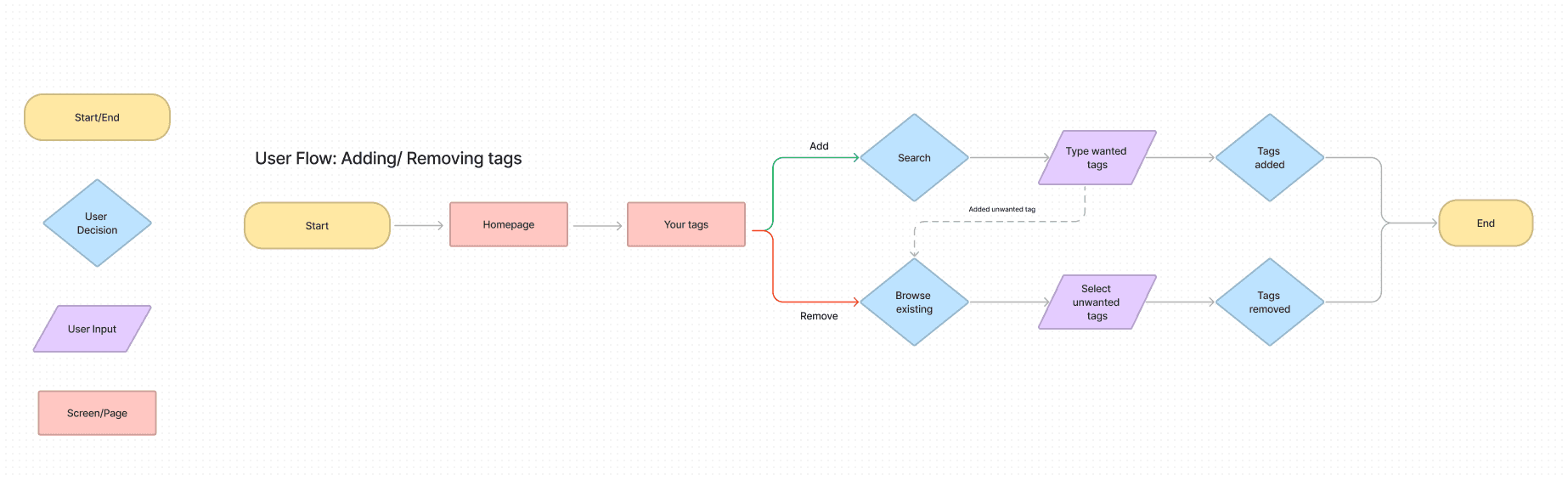 This user flow demonstrates the process of adding and removing tags. It begins with users accessing the YouTube platform and navigating to the tags page from the homepage. From there, users have the option to add or remove tags. If they want to add a tag, they are able to search the tag and select them to add. If users want to remove a tag they browse their existing tags and select those from the list they want to remove.