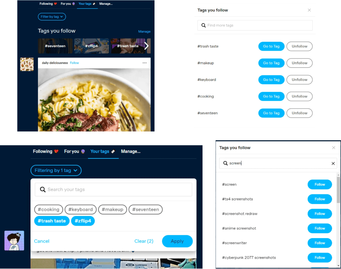 Tumblr emphasized personalization through user-curated tags. There are different feeds on your homepage, one shows the content of people you follow and another one would tag you follow. The tags are added by searching in a search bar.